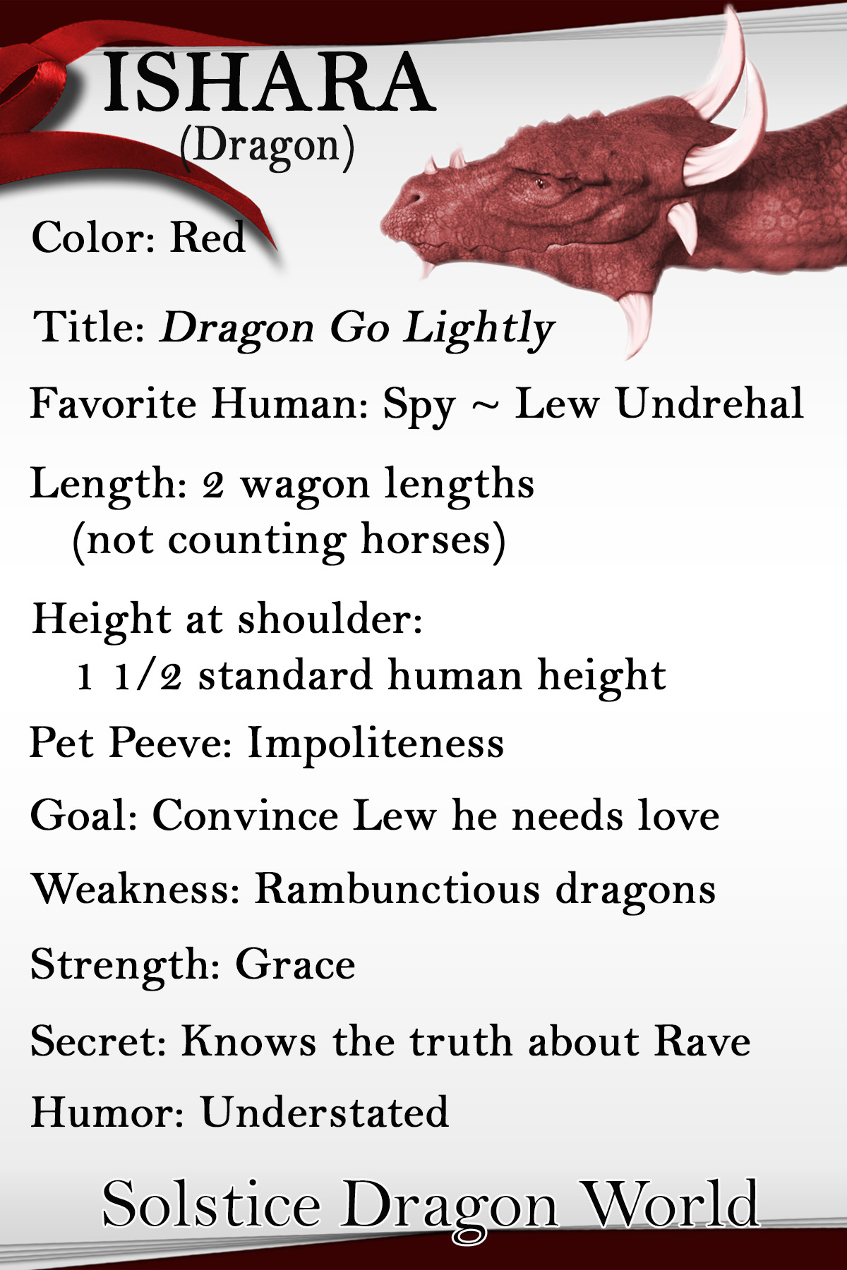 Ishara: Lew's closest friend and the dragon he counts on. She doesn't talk much, but she's watching all the time.